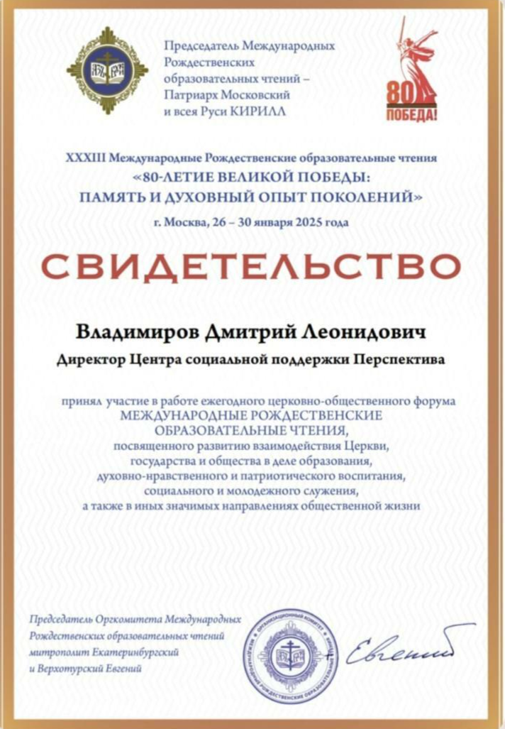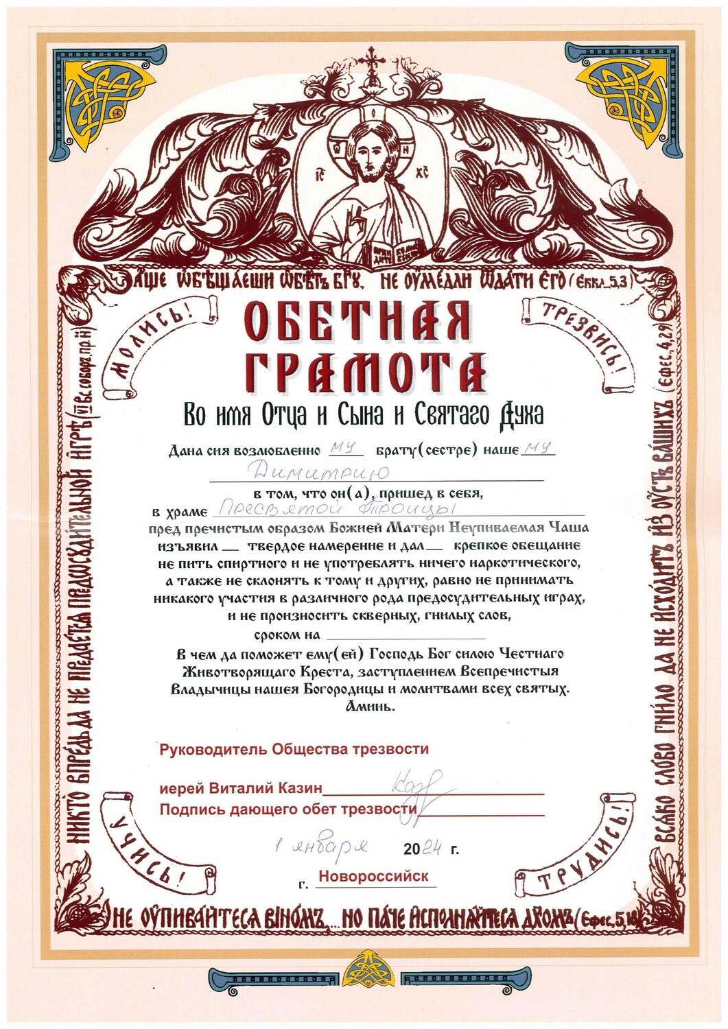 Президент «Перспективы» - Владимиров Дмитрий Леонидович, вместе с тремя руководителями филиалов своей организации, с октября 2023 года вступил в Общество трезвости, принес обет трезвости, постоянно участвует в Таинствах Покаяния и Причащения и в других сторонах приходской жизни Свято-Троицкого храма г. Новороссийска.